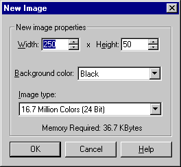 Per prima cosa, dopo aver fatto partire il programma, selezionare NEW dal menu FILE. Nella maschera che segue, inserire come dati: WIDTH=250 HEIGHT=50 BACKGROUNDCOLOR=Black IMAGETYPE=16-milioni-colori.